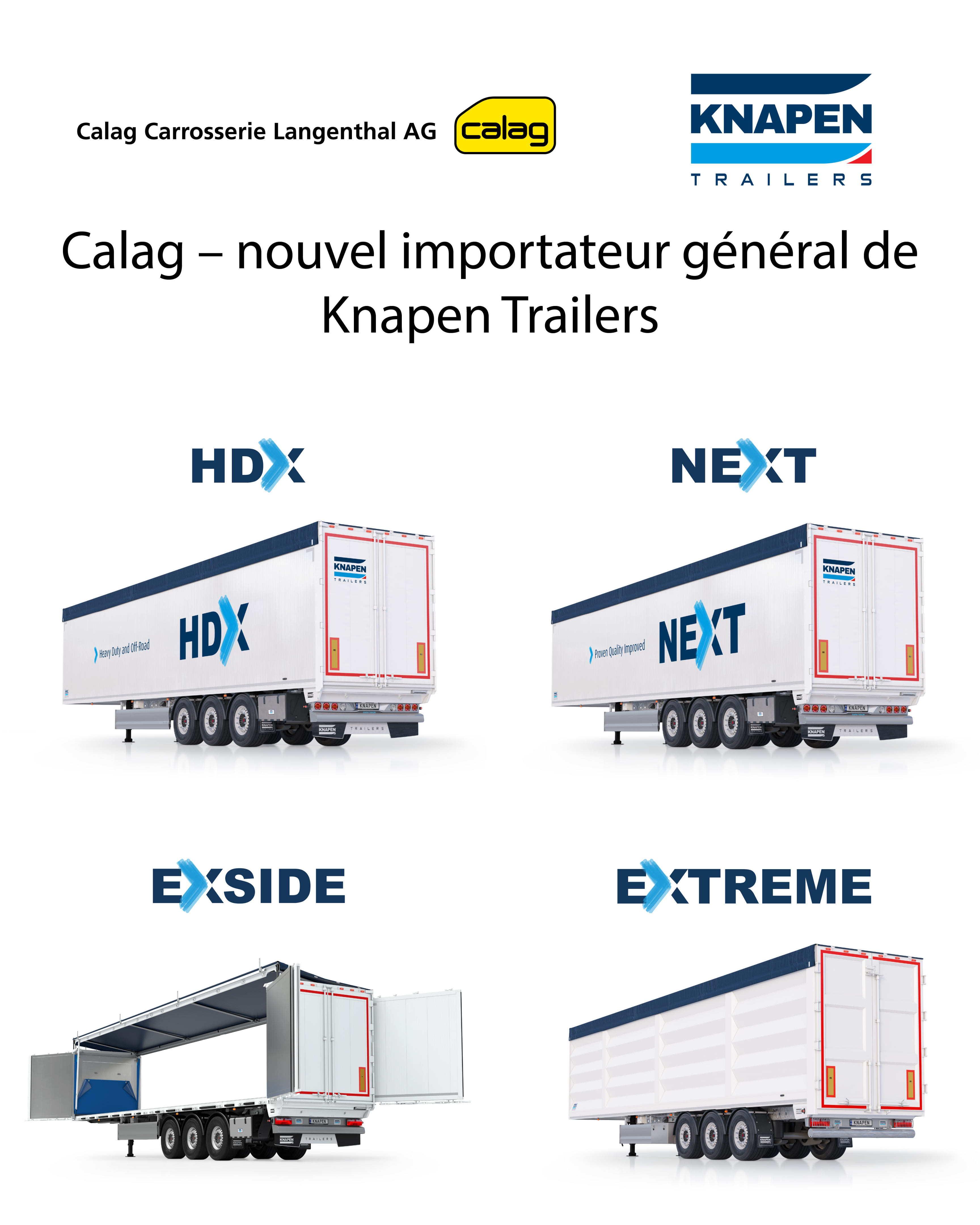 La société Calag Carrosserie Langenthal AG reprend dès à présent la représentation générale en Suisse du constructeur néerlandais Knapen Trailers, spécialiste des semi-remorques à fond mouvant.