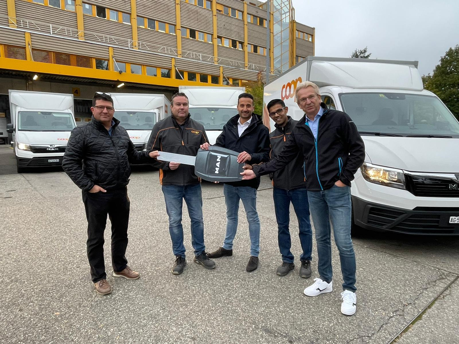Ausschlaggebend für die Wahl der TGE waren nebst dem Preis die Zuverlässigkeit, Belastbarkeit und die schnelle Be- und Entlademöglichkeit mit tiefer Ladekante. «Die Transporter mit gekühlten wie tiefgekühlten Lebensmitteln sind täglich bis 15 Stunden im Einsatz, jährlich bis zu 100‘000 km, und immer bei maximaler Zuladung mit der Feinverteilung an gegen 40 Stationen stark belastet», sagt Rolf Zeller, Leiter Auslieferlogistik von coop.ch. An der Schlüsselübergabe waren auch Dominik Schneider, Flottenmanagement bei Coop, dann Roland Duss, der Leiter Auslieferung Deutschschweiz von coop.ch, der coop.ch-Fahrzeugverantwortliche Sugithan Thiyagalingam und MAN-Van-Verkaufsmanager Luca Larosa sowie zwei Schulungsfahrer anwesend.