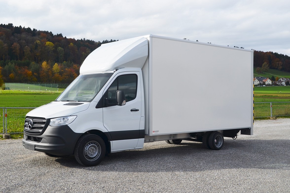 Mit einer Kastengrösse von 4’200/2’050/2’280 mm sowie Dachspoiler und dreifacher Aluzurrschienen und Hebebühne garantiert das Endprodukt eine Nutzlast von sagenhaften 1’065 kg. Die maximale Aufbaulänge mit einem Baldinger Ultra-Light-Chassis und dem Mercedes-Benz Sprinter beträgt über 6 Meter. «Weil das Ultra-Light-Chassis ohne Radkästen auskommt profitiert der Kunde in jedem Fall von der voll nutzbaren Ladefläche des Aufbaus.»