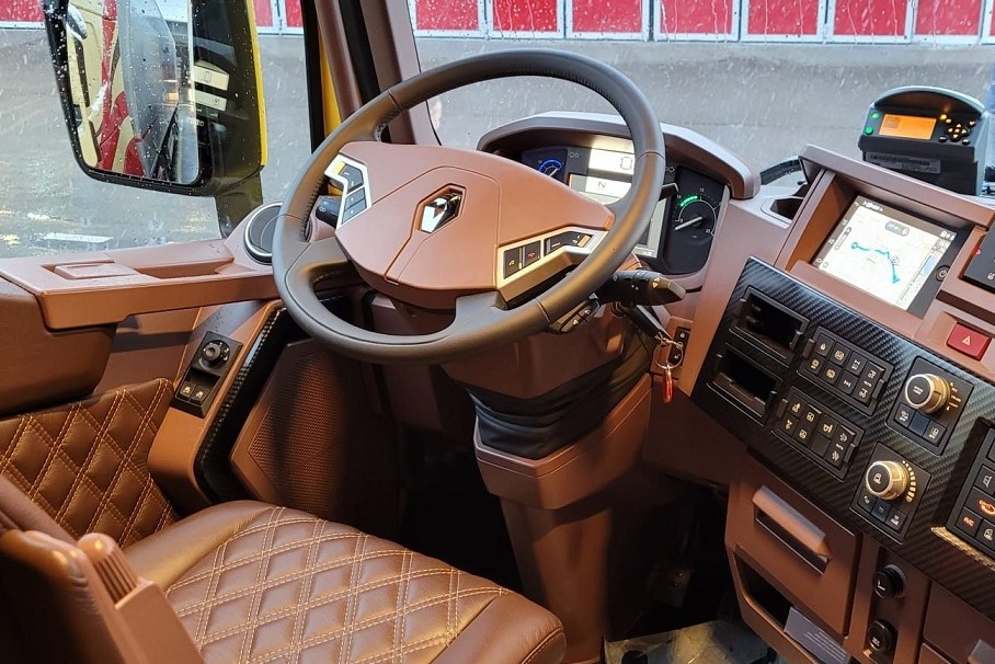 Die Zugmaschine des Sattelaufliegers wird von einem 13-Liter-Motor mit 520 PS befeuert, der über ein maximales Drehmoment von 2550 Nm verfügt. Diese Kennzahlen deuten schon an, was mit dem fein abgestimmten Einsatz des automatisierten Getriebes Optidriver quasi perfektioniert wird: Der DTI 13-Motor verbindet Leistungsstärke mit Wirtschaftlichkeit. Die «High Sleeper Cabine» bietet dem Fahrer mit ihrem durchgängigen Boden einen grosszügigen Arbeitsplatz, der durch die hochwertigen Materialien der Berliet Edition mit einer geradezu noblen Anmutung auftrumpft. Das neue Roadpad+ steht für ein Audio-, Entertainment- und Navigationssystem, das nicht nur höchsten Musikgenuss in die Kabine zaubert, sondern auch wertvolle Informationen in Echtzeit liefert. Vier Kameras verschaffen dem Fahrer ausserdem den Durchblick, was rund ums Fahrzeug abgeht. Optivision erweist sich in der Praxis im Hinblick auf die Wirtschaftlichkeit immer wieder von Neuem als wertvolles Instrument. Unter das gleiche Kapitel fällt das Paket Protect, welches dem Fahrer mit seinen zahlreichen Assistenzsystemen unter die Arme greift und ihn massvoll entlastet. Gekrönt wird dieser Zugewinn an Fahrkomfort mit dem Paket Comfort. Herz, was willst Du mehr?