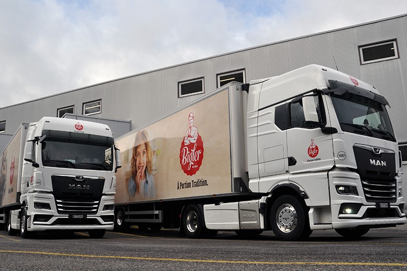 Bei der Bigler AG Fleischwaren in Büren an der Aare verrichten seit letztem Sommer zwei topausgestattete MAN-Sattelzugmaschinen TGX 18.470 zuverlässig ihren Dienst.