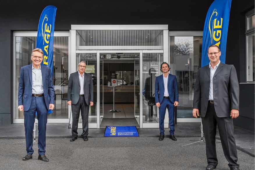Markus Bigler, Vertriebsleiter Garagenkonzepte der ESA, begrüsst Philipp Huber und die Huber Automobile AG, Mellingen, im Beisein der ESA-Gebietsleiter Remo Müller und Bekim Dragaj als 400. Partner im Kreis der le GARAGE-Familie.