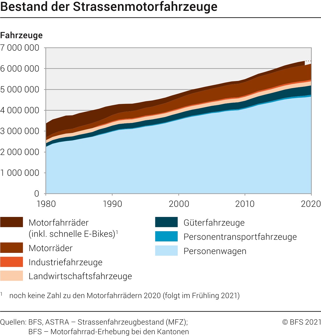 Am Referenztag, dem 30. September, waren schweizweit 6’241’141 Motorfahrzeuge zum Verkehr zugelassen, 80 879 bzw. 1,3Prozent mehr als im Vorjahr. Der Personenwagenbestand wuchs um 0,7Prozent (+34 383) auf insgesamt 4’658’335 Einheiten.