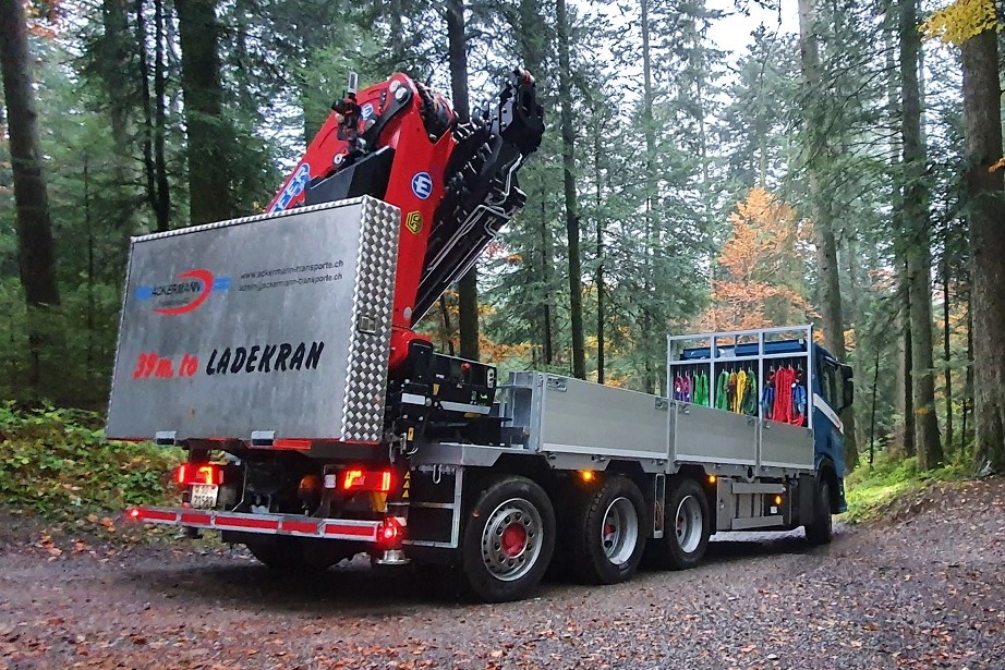 Um das absolute Maximum aus dem neuen Kranfahrzeug herausholen zu können, wählte Erich Ackermann eine CR17L Kabine, die es ermöglichte, den Brückenaufbau extrem nahe an die Kabine zu bauen, was schlussendlich der Fahrzeug- oder Brückenlänge und somit dem Transportvolumen zugutekam. Angetrieben wird der Scania durch einen Reihen-Sechszylinder-Motor mit 500 PS mit einem Drehmoment von 2'550 Nm. Dank automatisiertem Scania Opticruise-Getriebe kann sich der Fahrer um das Umfeld wie auch den immer dichter werdenden Strassenverkehr kümmern.