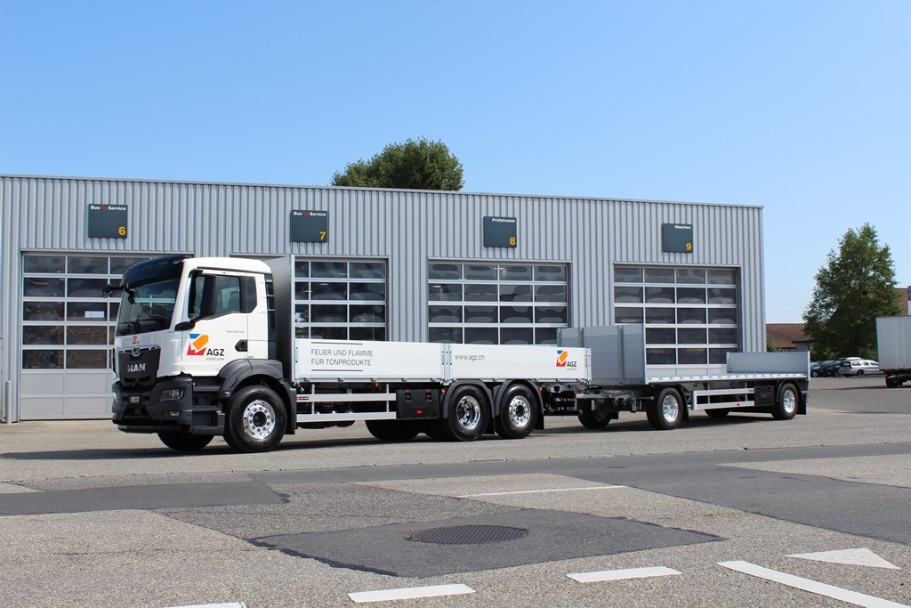 Die AGZ Ziegeleien AG betreibt ihren eigenen Fuhrpark. Die Hälfte der Fahrzeuge tragen stolz den MAN-Löwen auf dem Kühlergrill. Dies, weil die MAN Chassis unter anderem bezüglich des Gewichts und der Achskonfiguration immer wieder überzeugt haben.