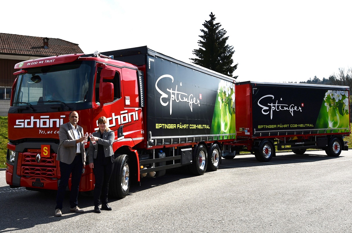 Die Schöni Transport AG lässt ihre gesamte Fahrzeugflotte von rund 270 Fahrzeugen schon seit längerer Zeit von März bis Oktober mit einem Anteil von 50 bis 80 Prozent Biodiesel laufen. Jetzt geht die Schöni Transport AG auch beim Biodiesel den konsequenten Schritt der Nachhaltigkeit weiter, den sich das traditionsreiche Transportunternehmen auf die Fahne geheftet hat. Seit Januar 2021 werden die Getränke der Mineralquelle Eptingen AG von der Rothrister Transportfirma zu den Kunden geliefert. Im Grundsatz gilt: Für Eptinger setzt Schöni auf eine neue Flotte, welche zu 100 Prozent mit Biodiesel betrieben werden kann. Der eingesetzte Biodiesel wird aus Reststoffen wie Fleischabfällen und Altspeiseölen hergestellt. Bei der Verbrennung dieses Biodiesels entsteht hauptsächlich biogenes CO2, das beim Aufbau der Biomasse der Atmosphäre entzogen wurde und nicht fossilen Ursprungs und damit nicht klimawirksam ist. Für Patron Daniel Schöni wie auch für Damaris Buchenhorner, VR-Präsidentin der Mineralquelle Eptingen AG, ist es eine besondere Freude und Genugtuung, dass das Eptinger Mineralwasser fortan CO2-neutral zu den Kunden gelangt.