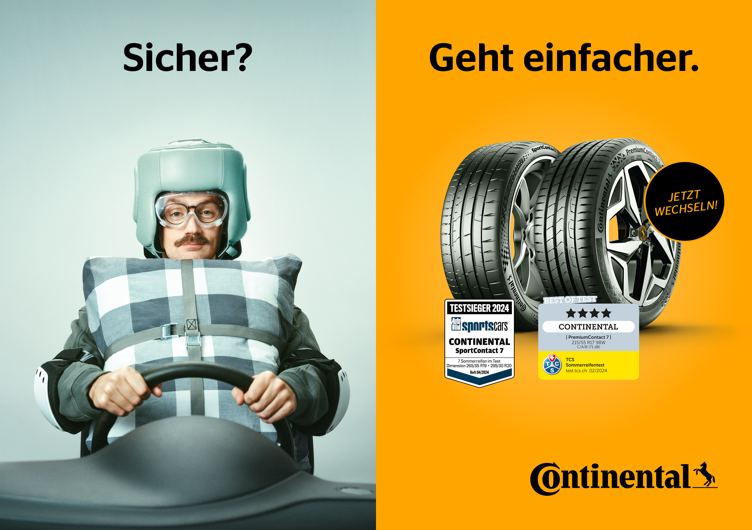Durch den kreativen Kampagnenansatz verdeutlicht der Reifenhersteller die besonders einfache Wahl, mit Reifen von Continental sicher unterwegs zu sein. Die Motive kontrastieren übermässige Sicherheitskleidung mit der prägnanten Botschaft: „Sicher? Geht einfacher.“