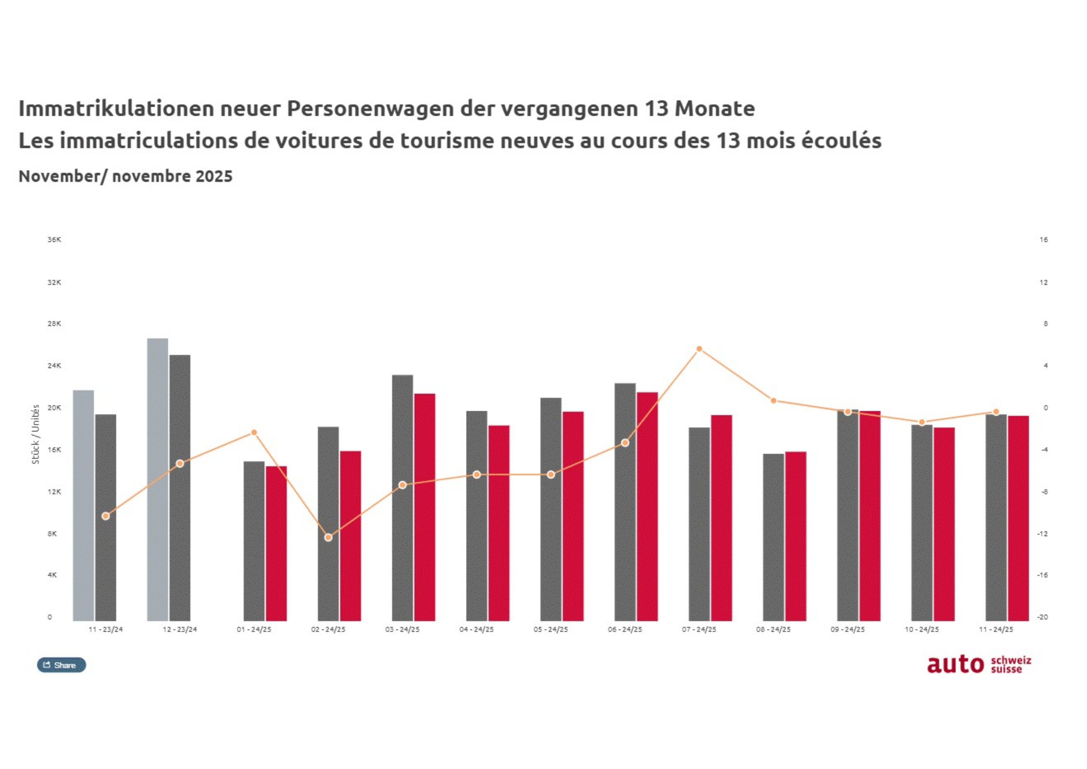 Trotz intensiver Verkaufsaktivitäten, attraktiven Angeboten und breiter Modellpalette zeigt der Gesamtmarkt kumuliert per Ende November 2025 keinen positiven Verlauf. Der Gesamtmarkt lässt angesichts eines Minus von 3.4% seit Anfang Jahr keine Erholung erkennen. Im Markt für neue Personenwagen in der Schweiz und im Fürstentum Liechtenstein bleibt die Trendwende bei den Elektro- und Plug-in-Hybridfahrzeugen im November aus. Damit bleibt die Nachfrage weiterhin deutlich hinter den klimapolitischen Erwartungen und den marktfernen Anforderungen der CO₂-Regulierung zurück.