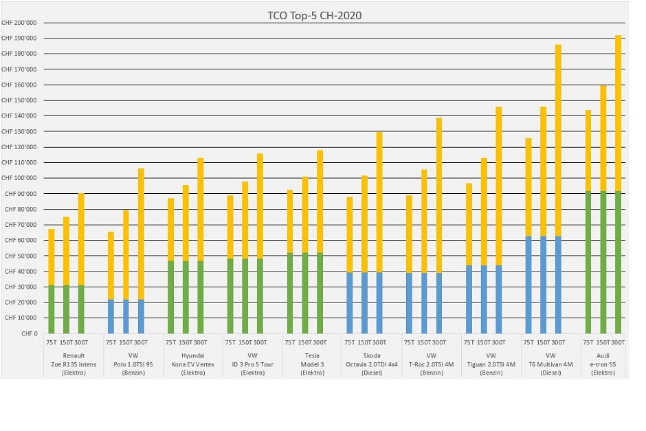 Die geringeren Treibstoffkosten und Servicekosten der Elektrofahrzeuge kumuliert über 10 Jahre Nutzungsdauer kompensieren ab einer gewissen Kilometerleistung deren höhere Neupreise. Je höher die Laufleistung ist, umso grösser ist das Einsparpotential der Treibstoffkosten bei Elektrofahrzeugen. Im Vergleich zum Vorjahr fällt diese Differenz kleiner aus, da mit Stromkosten von 0.20.- CHF/kWh (Vorjahr 0.15.- CHF/kWh), Benzinkosten von 1.45.- CHF/Liter (Vorjahr 1.61.- CHF/Liter), Dieselkosten von 1.53.- CHF/Liter (Vorjahr 1.73.- CHF/Liter) gerechnet wurde*.