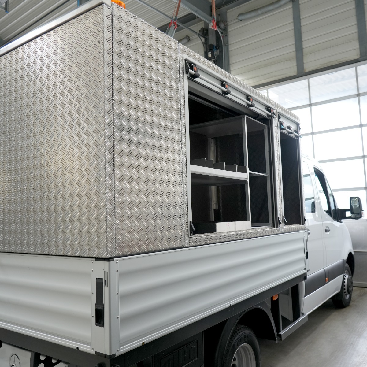 Besonders spannend wird es, wenn Sonderanfertigungen gewünscht sind: integrierte Ladevorrichtungen, klappbare Arbeitsflächen, Beleuchtung, Sicherheitssysteme oder sogar eine Kombination mit Sortimo Fahrzeugeinrichtung oder WorkMo-Elementen.