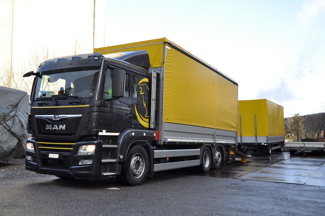 Trans Tech R. Suter possède non seulement une expérience de plusieurs décennies dans ce domaine, mais aussi les appareils et équipements appropriés. Il s'agit notamment de chariots élévateurs lourds compacts de Clark ou Kalmar, d'un poids à vide allant jusqu'à 10 tonnes. Depuis l'automne 2019, ces derniers sont transportés par le nouveau MAN TGS 26.460 6x2-4 LL équipé d'une cabine L et de la TipMatic. La superstructure de Birrer avec une bâche jaune semble peu impressionnante à première vue, mais elle est dotée de quelques «perles» techniques: à l'arrière, une unité de levage Dhollandia de 10 tonnes, un treuil encastré dans la paroi avant, des rails de fixation solides sur la surface de chargement et les parois, et un système AirPipe sur le toit pour empêcher l'accumulation de l'eau de pluie. Alors que la superstructure à bâche est réglable en hauteur via un système hydraulique, l’unité de levage et le treuil sont actionnés par l'électricité – le chargement et le déchargement des chariots élévateurs lourds, en particulier, en consomment beaucoup. Toutefois, cela ne pose aucun problème pour le TGS, qui est équipé en usine d'un puissant alternateur et d'un gros bloc de batteries.