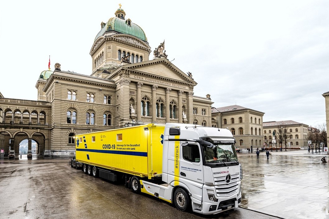 Il est maintenant sur la route, l'Actros Covid Test Truck du canton de Berne. En tant que station mobile pour des tests de masse en cas d'épidémies locales, en tant qu'installation de test à bas seuil dans sa propre commune d’habitation - et un jour peut-être même lors de festivals. Elle est rendue possible grâce à une équipe qui donne le meilleur d'elle-même et un partenaire solide.