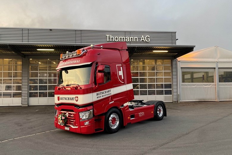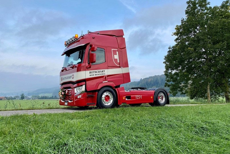 Trois tracteurs arborent le losange du constructeur français de véhicules industriels. « Mon père a acheté son premier véhicule Renault Trucks il y a huit ans, puis a renouvelé l'expérience par l'acquisition de deux autres », explique Rico Betschart. « L'évolution fulgurante de la marque est tout simplement incroyable ! » Un enthousiasme qui se reflète dans les décisions prises, dit-il : « La moitié de nos véhicules sont désormais des Renault Trucks. »