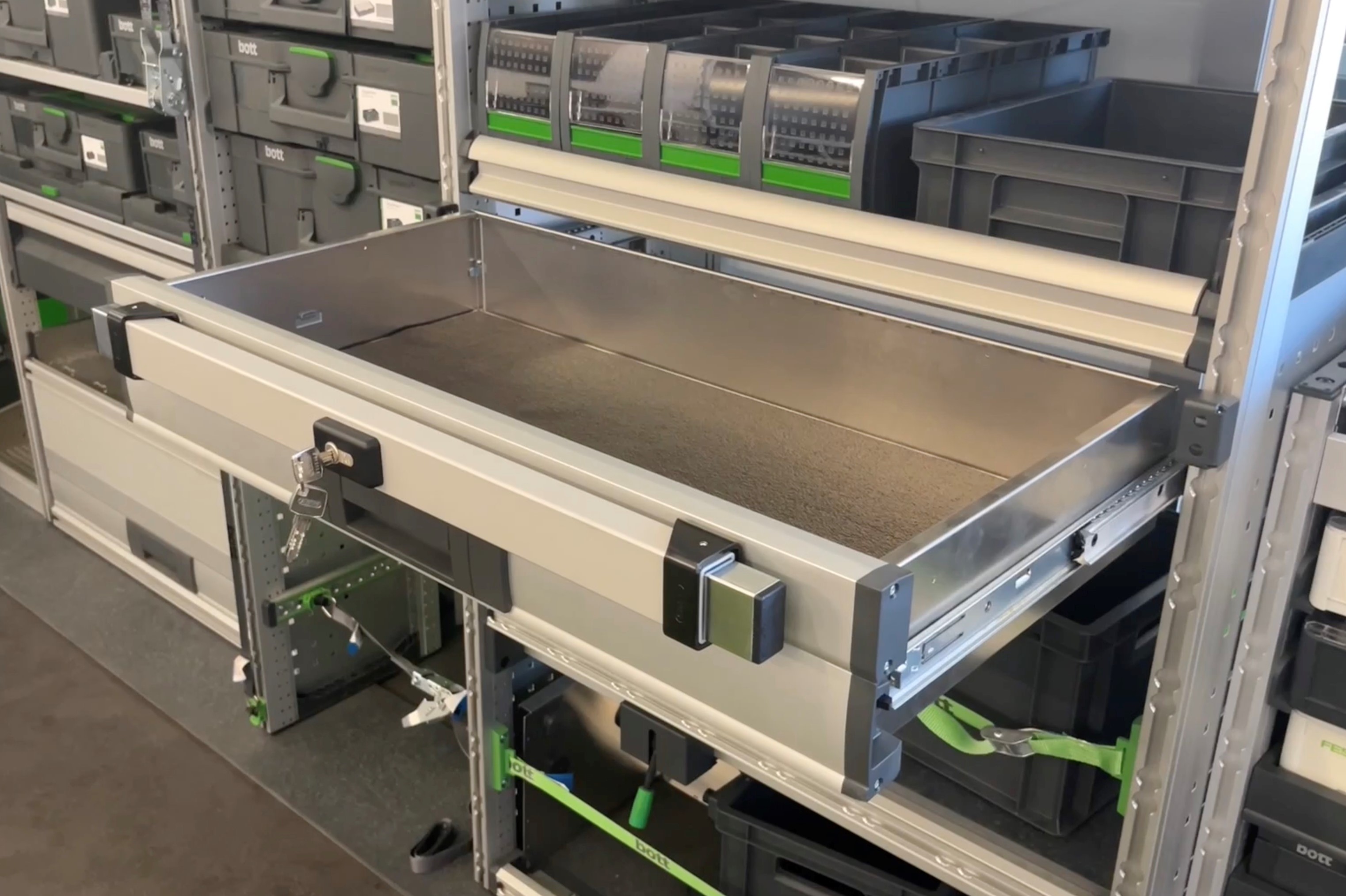 Tout peut désormais être rangé en toute sécurité et confortablement dans les nouveaux tiroirs de sécurité bott vario3. Grâce au verrou blindé ABUS et à la serrure à cylindre, le tiroir résiste sans problème à la violence.