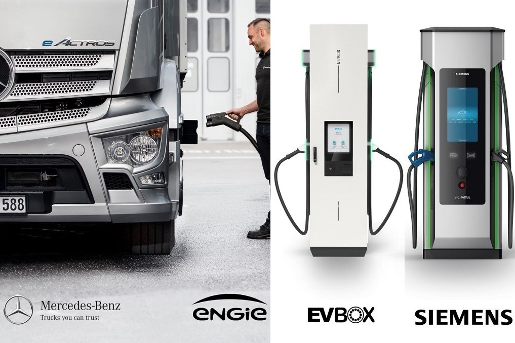 Mercedes-Benz Trucks établit un partenariat avec Siemens Smart Infrastructure, ENGIE et EVBox Group. Siemens Smart Infrastructure, ENGIE et EVBox Group apportent non seulement leur soutien grâce à un savoir-faire complémentaire en matière d’approvisionnement en énergie mais aussi grâce à des solutions d’infrastructure de charge pour la recharge centralisée des flottes de camions en dépôt.