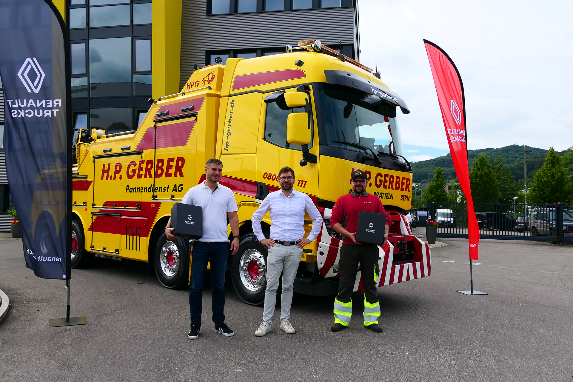 HP_Gerber_Pannendienst_AG_01: de g. à dr.: Roman Gerber (propriétaire, H.P. Gerber Pannendienst AG), Armin Zutter, conseiller de vente (Renault Trucks (Suisse) SA), Silvan Bühler (dépanneur, H.P. Gerber Pannendienst AG)