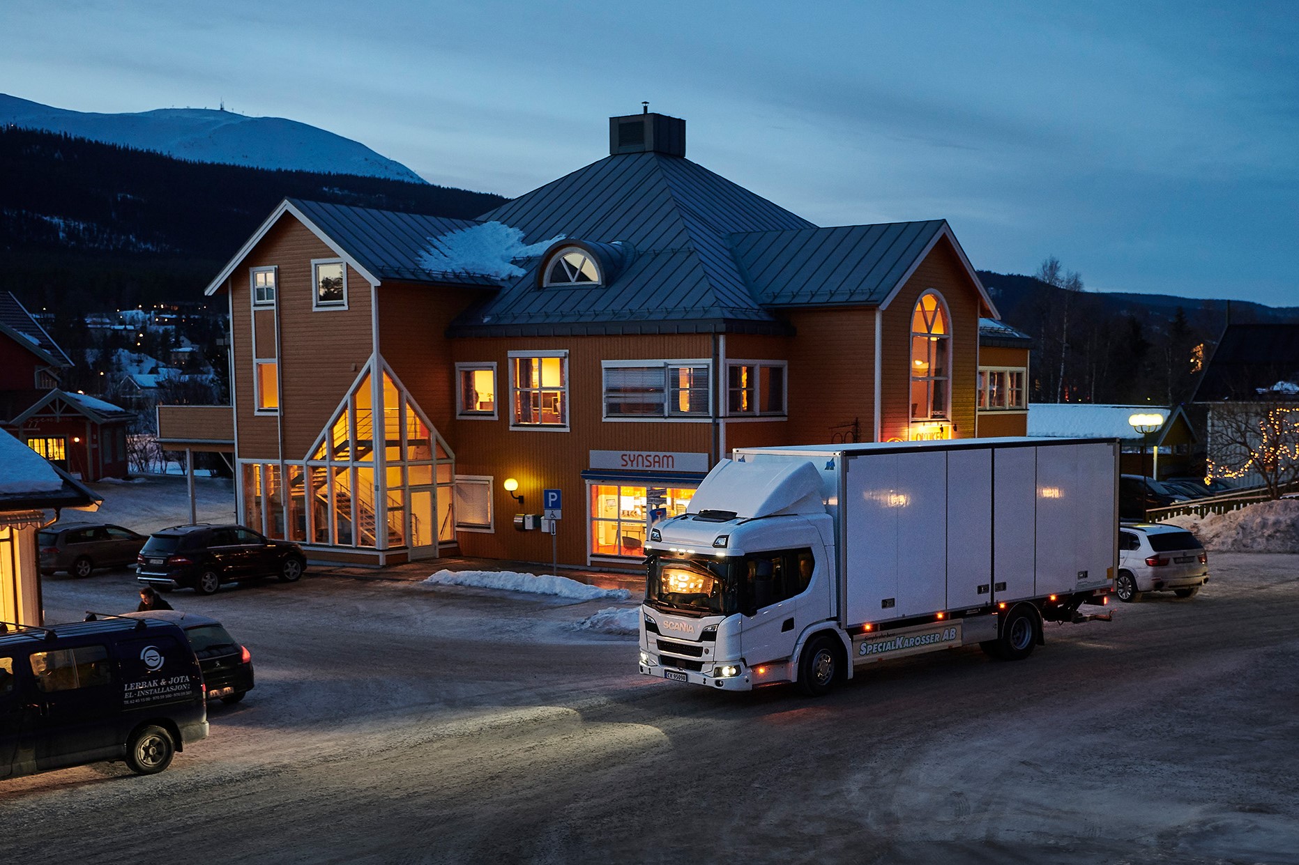 Après la «parade des camions», le choix est difficile: les journalistes du Benelux, d'Italie ou de la République tchèque présents sont surtout attirés par les combinaisons de véhicules longs et lourds qu’ils peuvent conduire ici, et seulement ici. Et il y en a toute une série. Le fait que les conditions de route soient hivernales est quelque peu éclipsé par la grande confiance que les «pilotes d'essai» accordent aux Scania, qui sont tous équipés de pneus d'hiver. Les conditions météorologiques permettent aux véhicules et à leurs remorques de circuler également sur la route de campagne – ce qui était différent lors des hivers précédents. Cependant, il vaut certainement la peine de choisir d'abord un «petit» camion – le P 320 Hybrid, par exemple, juste pour se faire une idée de la route et des caractéristiques de conduite avec un véhicule en solo (voir aussi l'encadré: La voie de l'électrification de Scania). Et, surtout, de se faufiler tranquillement dans la ville de Trysil, en mode électrique.