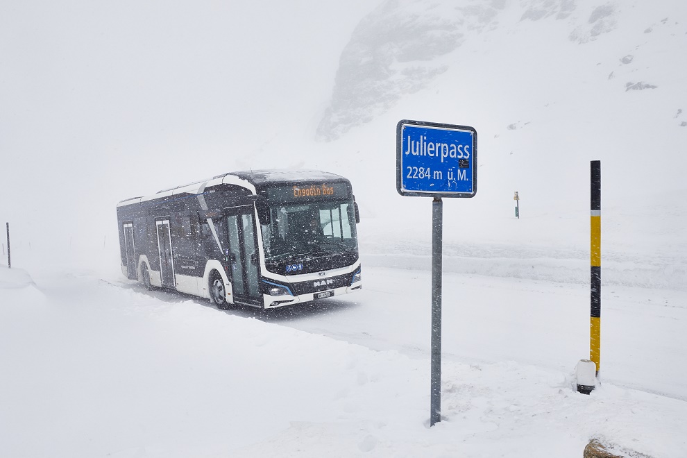 Le premier MAN Lion’s City 12 E 100 % électrique homologué en Suisse entame ses parcours d’essai sur les routes de l’Engadine. Le bus électrique de 12 mètres de longueur est intégré dans la flotte et testé par Bus und Service AG (BuS AG, l’exploitant de Engadin Bus et de Chur Bus).
