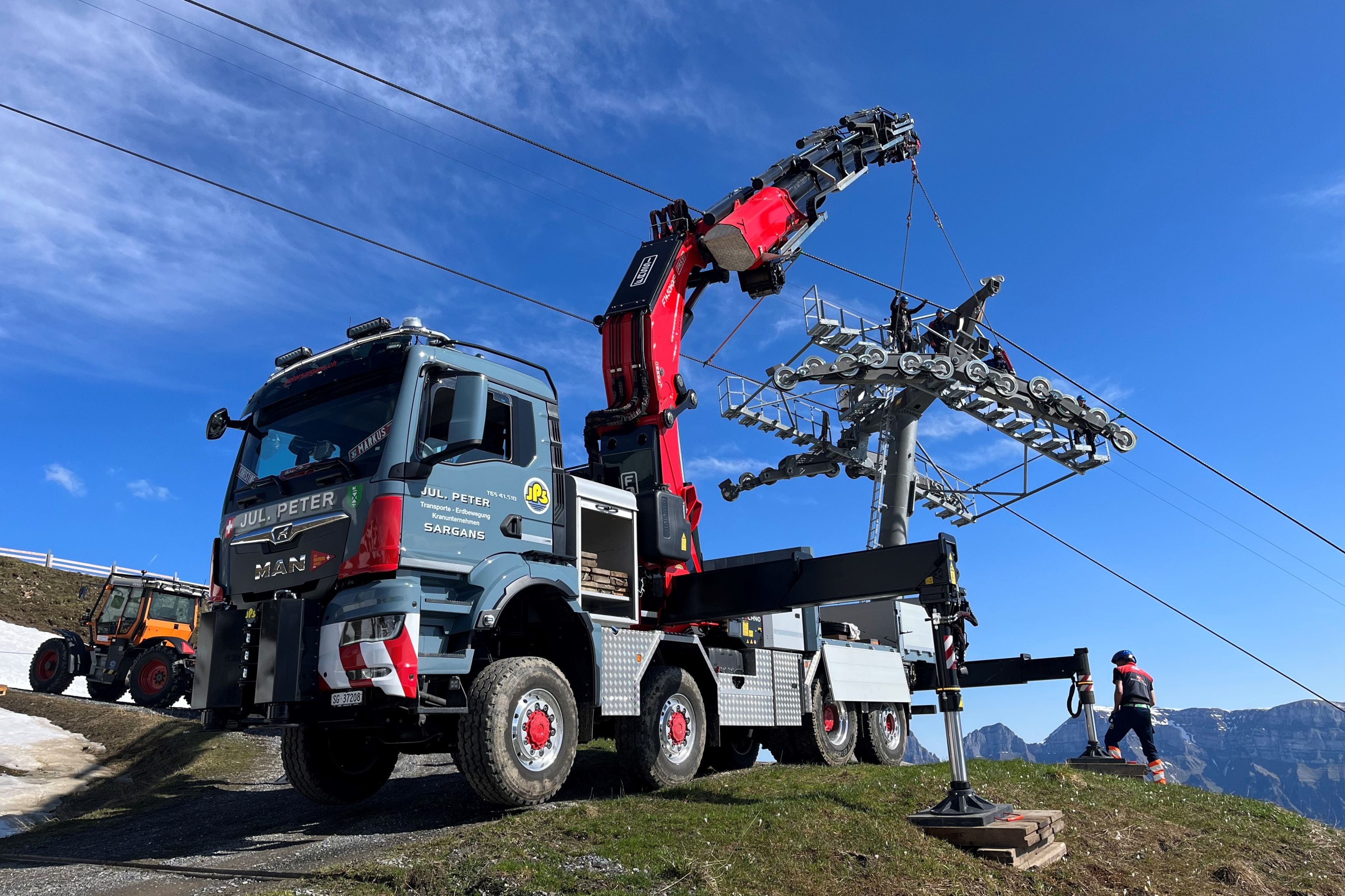 Le MAN TGS 41.510 8x6-6 flambant neuf de la petite entreprise familiale Jul. Peter Sargans est le seul camion MAN au monde de ce type. Depuis la mi-mars, il est sollicité pour les interventions difficiles nécessitant une grue.