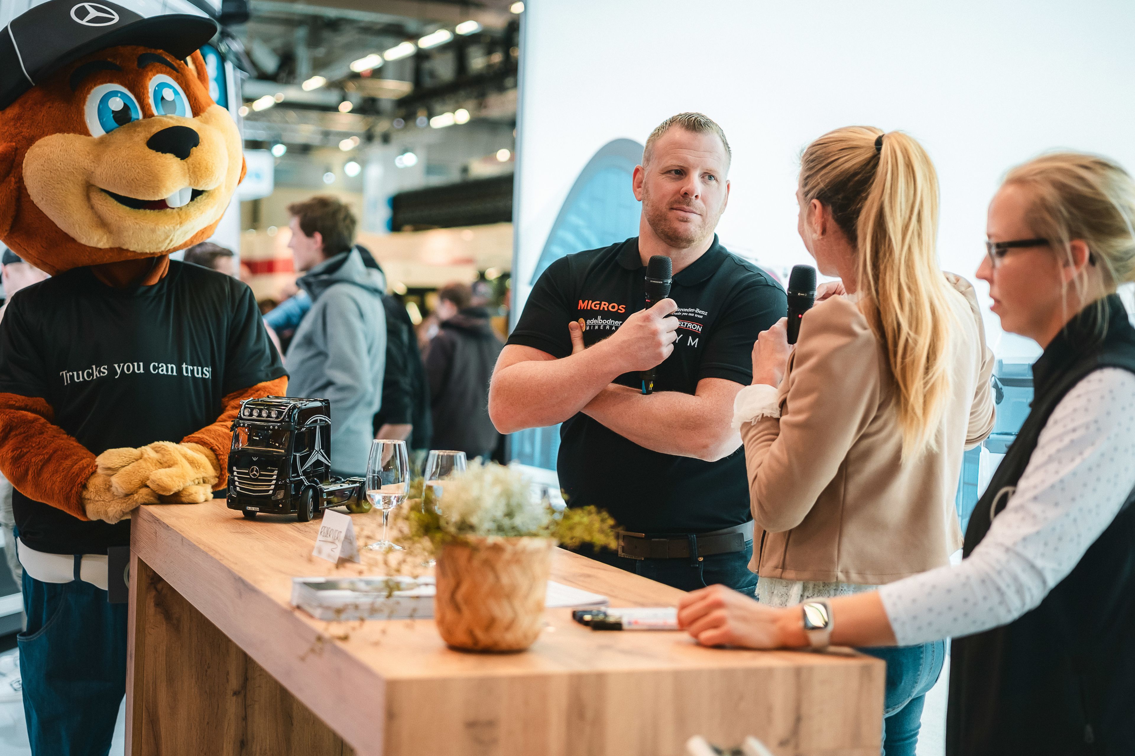 Lors de la journée de clôture du rendez-vous de la branche carrosserie-CH, transport-CH et aftermarket-CH, Matthias Glarner a visité le stand de Daimler Truck Schweiz AG en tant qu'ambassadeur de la marque Mercedes-Benz Trucks.