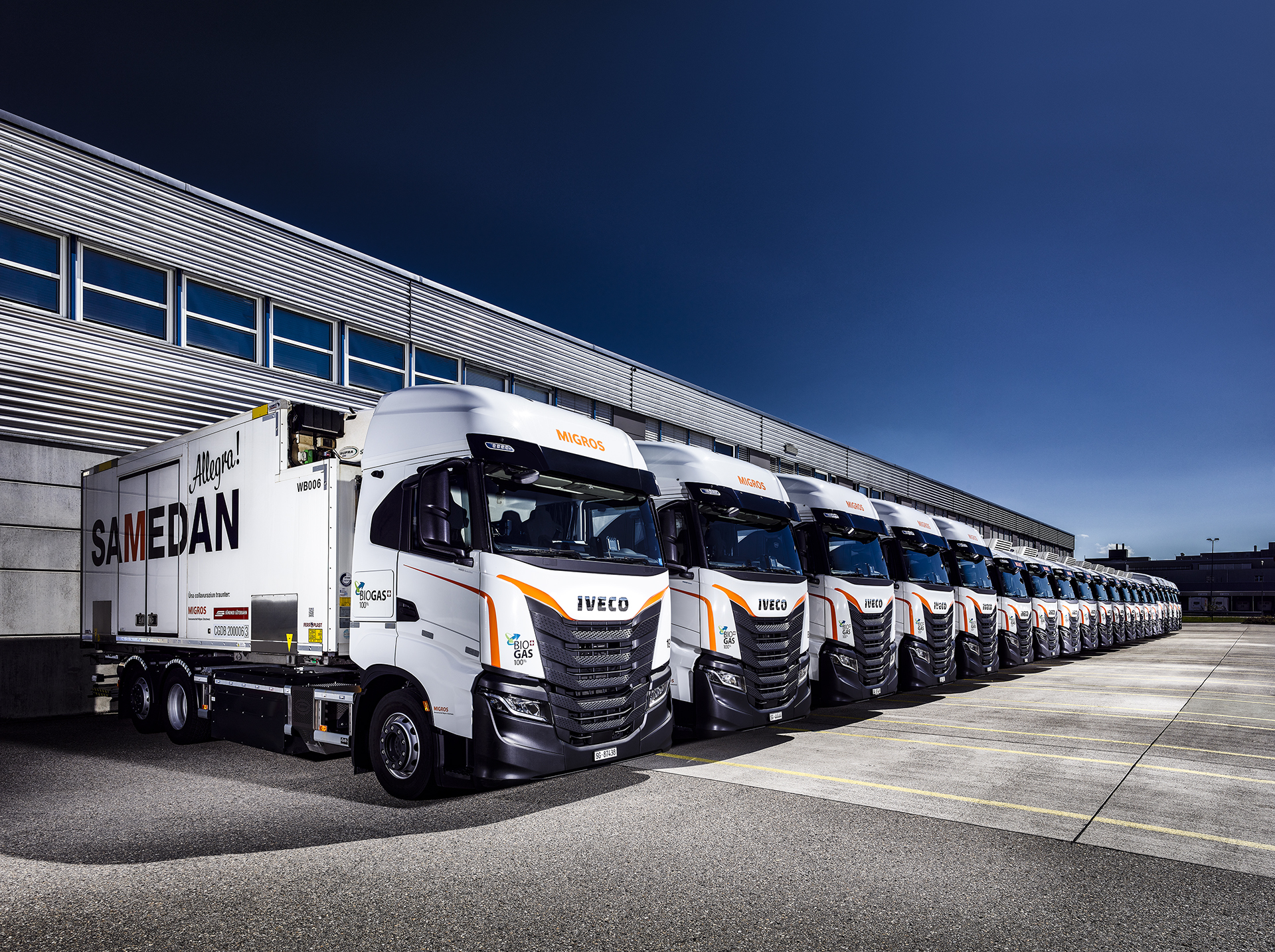 Migros Suisse orientale a choisi IVECO Suisse comme fournisseur pour ces nouveaux véhicules. «Nous sommes fiers de franchir cette étape importante avec nos véhicules IVECO. Ils sont non seulement respectueux de l’environnement, mais offrent également des avantages en termes de rentabilité. Avec l’IVECO S-Way Natural Gas, nous offrons une solution contribuant de manière pertinente à la décarbonisation», souligne Riccardo Virga, directeur général d’IVECO (Suisse) SA. Cette nouvelle flotte de véhicules se compose de huit tracteurs AS440S46 TP CNG à gaz de 460 ch avec cabine chauffeur longue distance et équipement confort, dix camions AD190S40 P CNG à gaz de 400 ch avec carrosserie frigorifique et cabine réduite, ainsi que deux AS260S46Y FS CM CNG à gaz de 460 ch à plateforme interchangeable. Ces véhicules ont été équipés de deux packs de réservoirs CNG de 526 l chacun, ce qui leur confère une autonomie d’environ 450 kilomètres. Ils sont tous équipés des systèmes de sécurité déjà disponibles tels que l’assistance au freinage d’urgence, l’assistance au maintien de la trajectoire, l’assistance à la détection de fatigue et, sur demande de Migros Suisse orientale, l’assistance au changement de direction. Pour améliorer les valeurs de consommation, les véhicules disposent en outre de boîtes de vitesses automatisées, ainsi que de freins sans usure (ralentisseurs) et de fonctions ECO telles que les changements de vitesse optimisés et l’ECO-Roll.