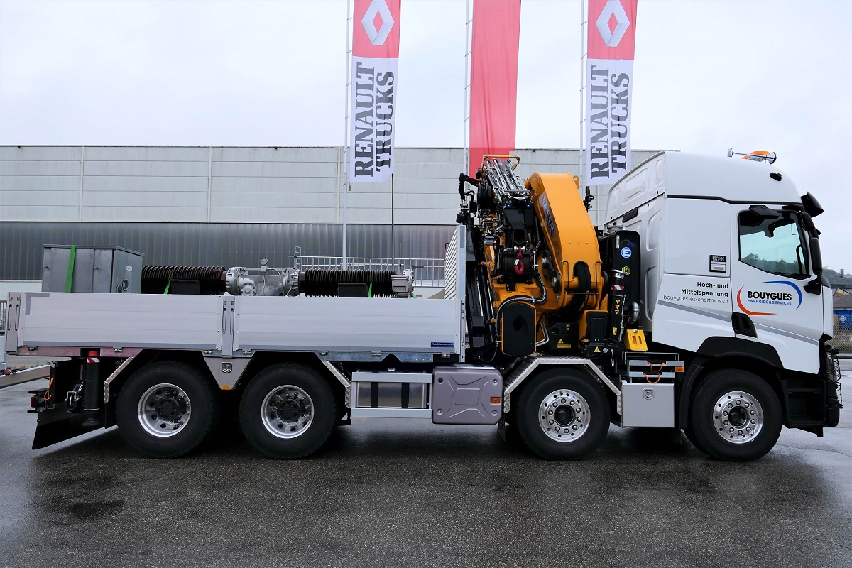 Le camion à quatre essieux d'un poids total de 40 tonnes et propulsé par un moteur six cylindres de 520 cheveaux pourra pleinement exprimer sa puissance au service de la société Bouygues E&S EnerTrans AG. Le châssis renforcé, le stabilisateur à l'avant du véhicule et la rampe lumineuse d'avertissement montrent clairement que ce véhicule est destiné à des « missions hors normes ». Sans oublier un autre équipement important, la grue embarquée, une grue Effer 955 95 m/t, qui, déployée à 32 mètres, affiche encore une capacité de charge de 810 kg. L'équipement est complété par un panier, qui peut être fixé à la grue pour effectuer des travaux en hauteur. Le tout a été conçu dans le respect strict des normes de sécurité applicables au domaine de la haute tension. Les caméras latérales et arrières assurent une visibilité panoramique, tandis que le pack Protect de Renault Trucks pour les missions de chantier offre un niveau de sécurité accru. Pour les deux conducteurs du nouveau C520, un rêve est devenu réalité, et la direction de Bouygues E&S EnerTrans AG est également satisfaite et conquise.