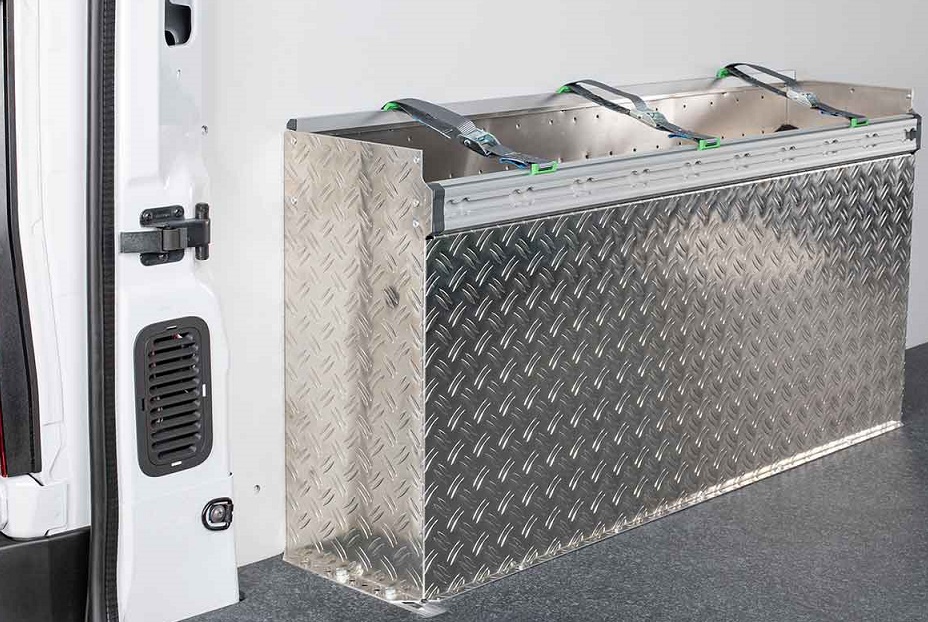 Un bac est encastré dans le revêtement de 45 cm de haut, dans lequel on peut par exemple ranger des outils et des pièces de rechange. Il a une largeur de 22,4 cm et est disponible dans les longueurs 97,4 cm et 108,6 cm. Un tapis antidérapant maintient les objets transportés. En option, l'habillage est équipé du système breveté C-Lash. Les sangles d'arrimage correspondantes peuvent être accrochées rapidement et facilement sur les bords du bac. Une seule main suffit pour y fixer des objets de grande taille. Le rail de fixation Airline standard permet également d'attacher les marchandises situées à côté du passage de roue avec des sangles. L'habillage est en tôle larmée en aluminium robuste.