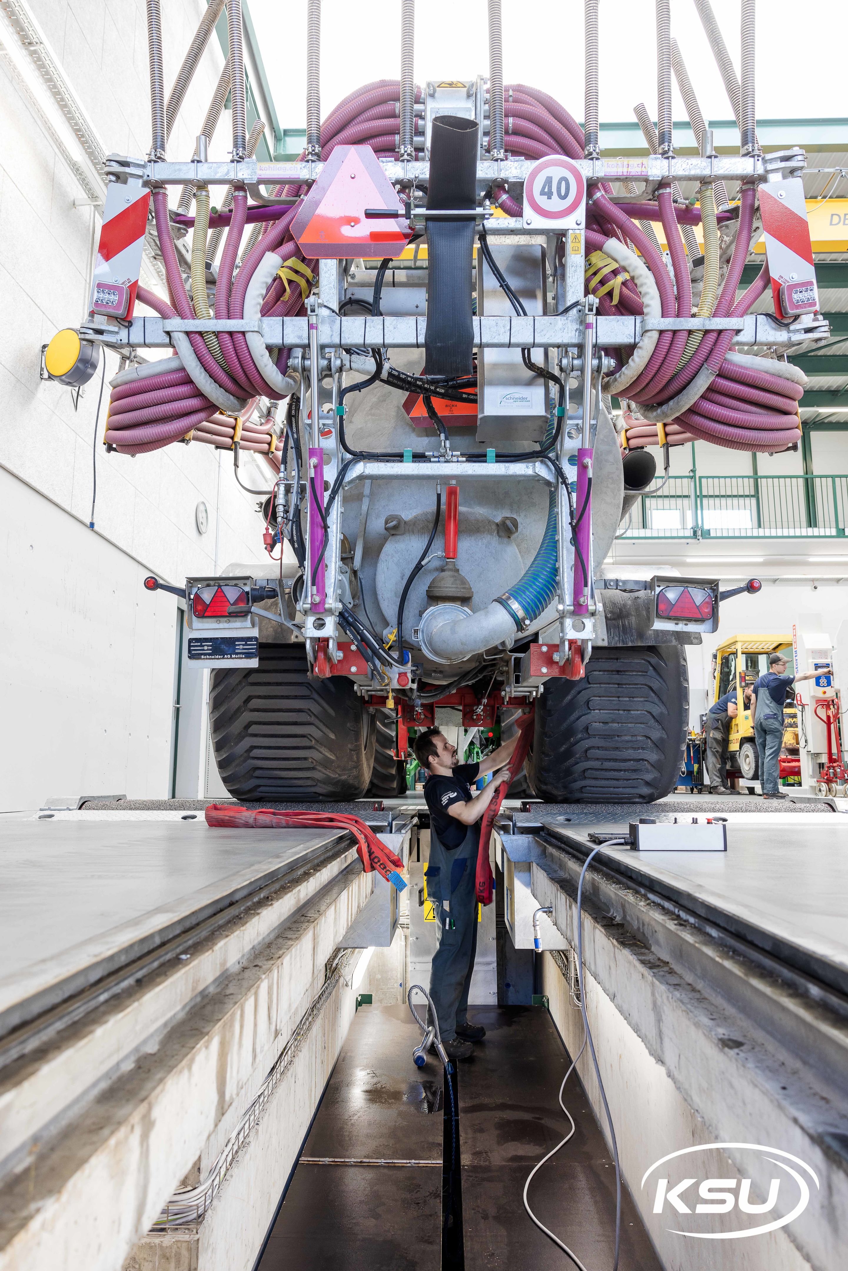 Grâce à l'installation de rouleaux de contrôle de 160 cm de large, nous pouvons mesurer sans problème des véhicules à voie étroite (véhicules communaux) et aussi des remorques très larges (presses à balles). C'était un problème pour nous auparavant, car nos véhicules étaient soit trop étroits, soit trop larges pour les bancs d'essai utilisés dans le secteur des véhicules utilitaires.