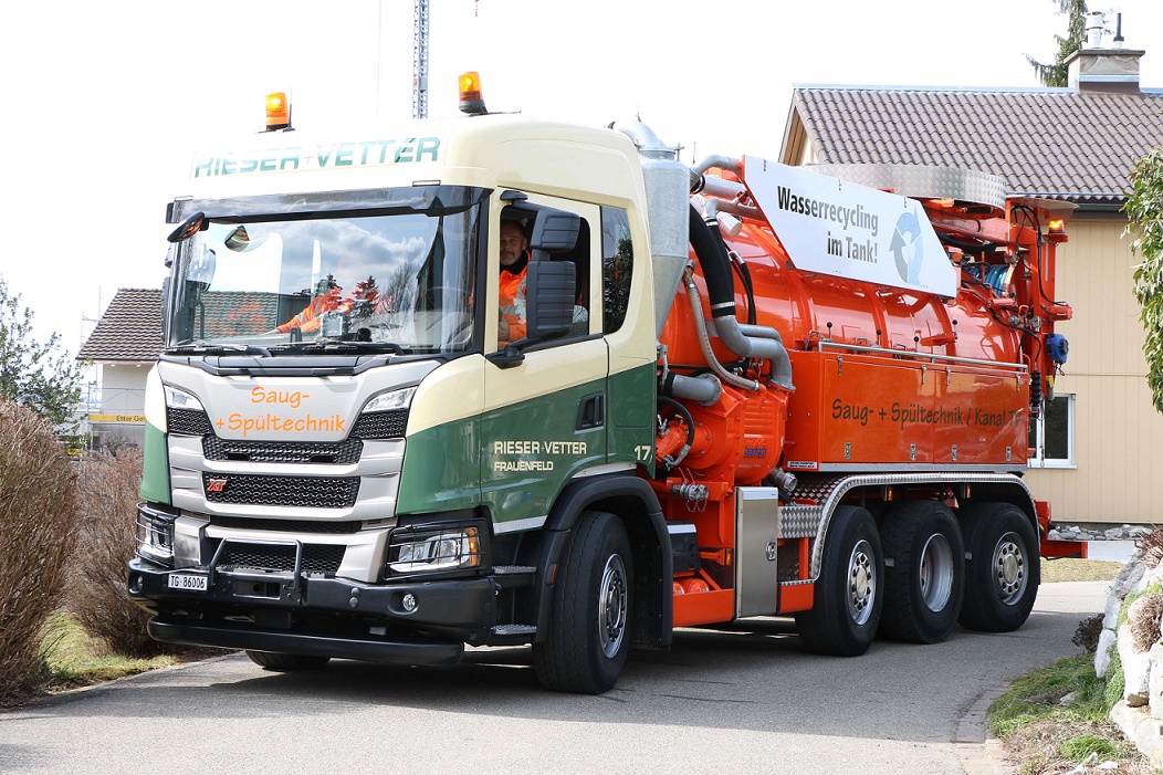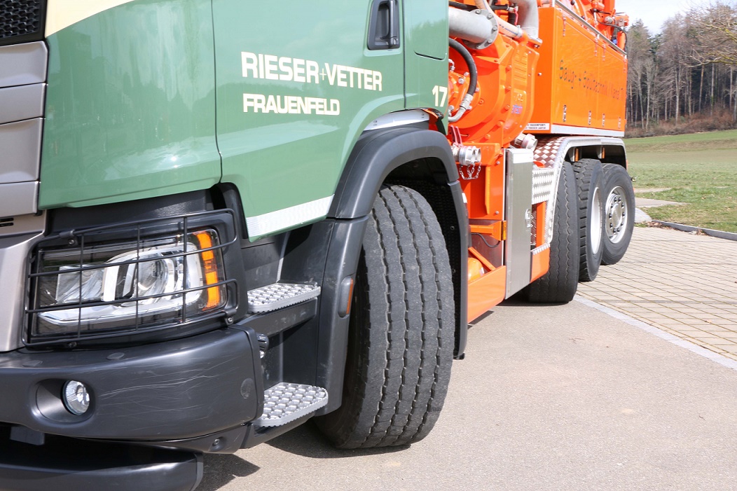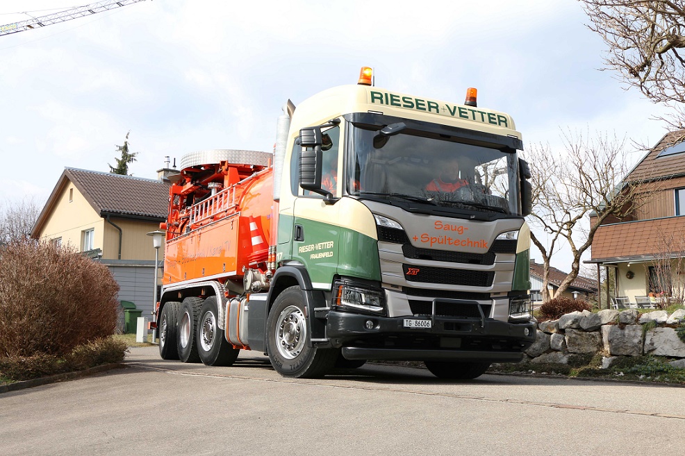 La société Rieser + Vetter AG, basée à Frauenfeld en Thurgovie, utilise un Scania G500 B 8x2/*6 NA XT depuis près de deux ans. La première chose que l'on remarque en regardant ce véhicule extrêmement compact, ce sont les trois essieux arrière.