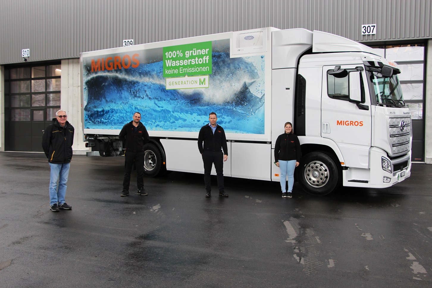 Deux employés de la coopérative Migros Zurich GMZ atelier de réparation se sont réunis le 16 octobre pour accueillir le nouveau camion à hydrogène à Herdern. Tous deux ont écouté attentivement, mais lorsque le camion a tourné au coin de la rue, on n'entendait presque rien. Nadine Sigrist sort joyeusement du véhicule. C'est la première femme à être autorisée à conduire ce camion à l'avenir. « Je connais déjà le silence du véhicule grâce à nos autres camions électriques. Je pense que c'est un véhicule cool qui nous fait faire un grand pas vers l'avenir », déclare fièrement la conductrice passionnée.