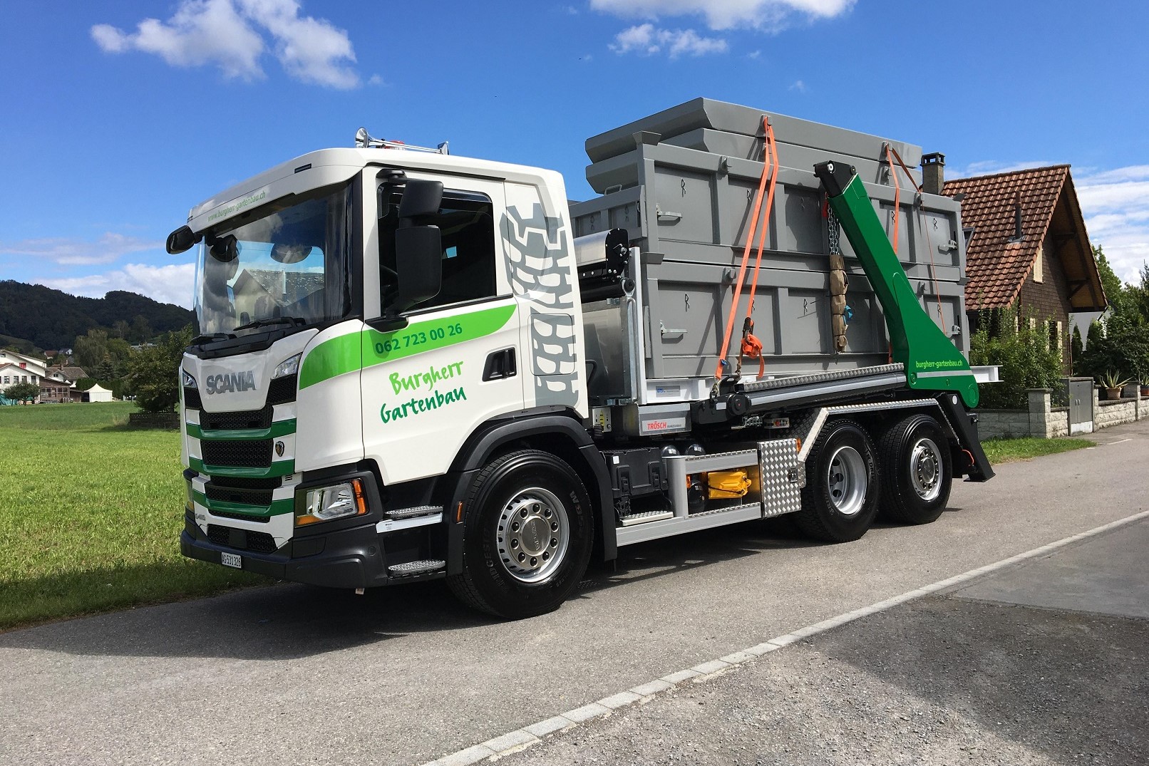 Avec Christoph Perrin de Scania Schweiz AG à Othmarsingen, un Scania G410 B 6x2*4 NB a été choisi comme véhicule de base pour le nouveau camion multibenne. La suspension pneumatique intégrale assure un excellent confort de conduite sur et hors des routes pavées. Grâce à son essieu traîné orientable et relevable et à son empattement court, le nouveau véhicule est également très manœuvrable et peut atteindre facilement même les points de chargement ou de déchargement difficiles d'accès. Le nouveau véhicule de Burgherr Gartenbau est complété par une cabine compacte CG17L, qui est accessible par quelques marches et offre au conducteur un confort optimal.