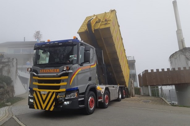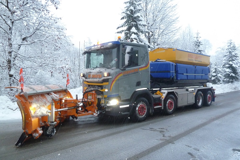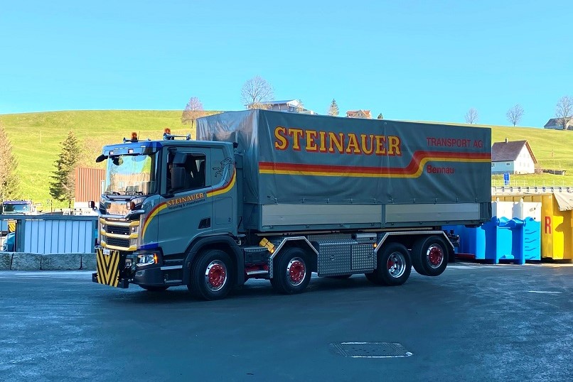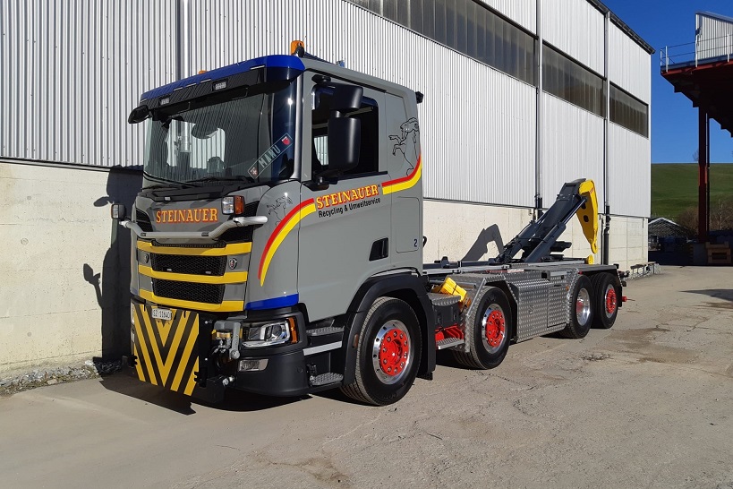 Le nouveau Scania R500 B 8x2*6 NB avec crochet de levage a été mis en service à temps pour l'hiver. Le camion à quatre essieux 8x2*6 a une suspension pneumatique intégrale et un empattement de 4’950 mm. Une cabine CR17L et une préparation pour l'entretien hivernal complètent le nouveau véhicule. Grâce au dispositif à crochet, il est désormais possible d'y monter les carrosseries les plus diverses, ce qui fait de ce véhicule un élément polyvalent du parc automobile de la société Steinauer AG Recycling & Umweltservice.