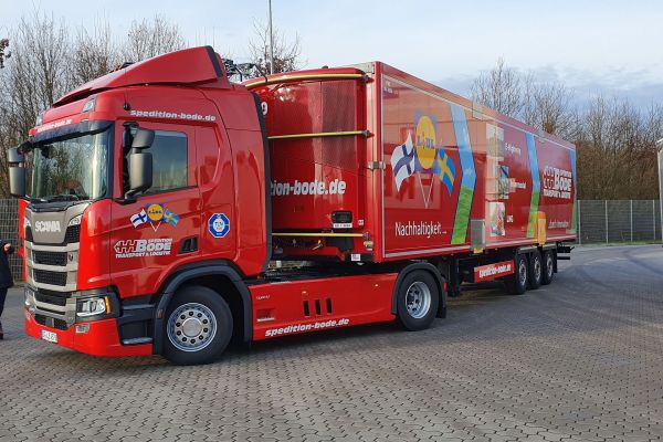 Livraison d'un camion Scania alimenté par ligne aérienne à Spedition Bode